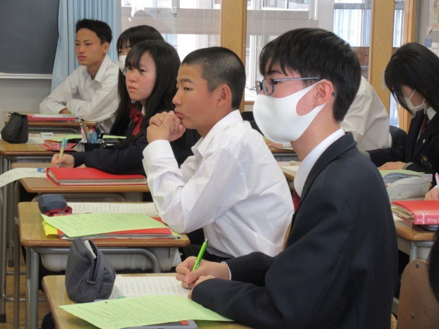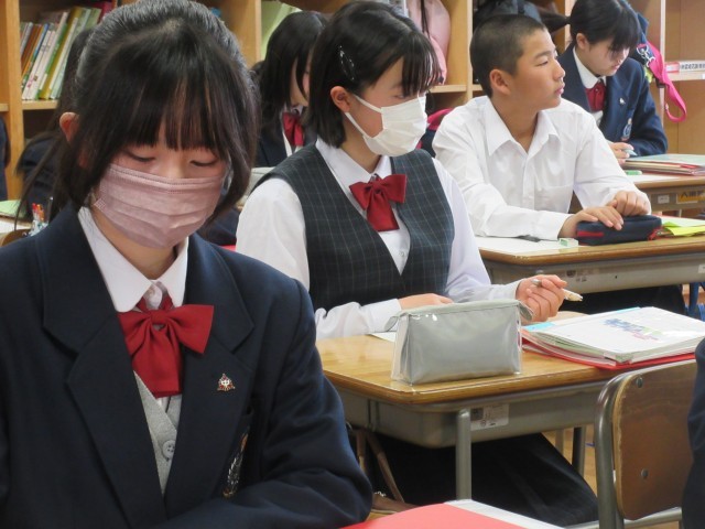 8年4組・英語の授業の様子です。Unit-7『What are World Heritage sites and their problems ?』(世界遺産と、それらが抱える問題)の学習を終え、話す活動に特化した発展学習に取り組んでいます。