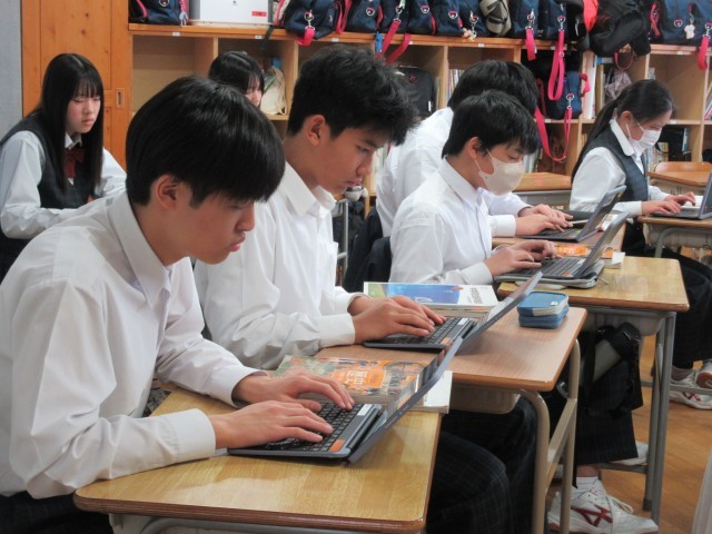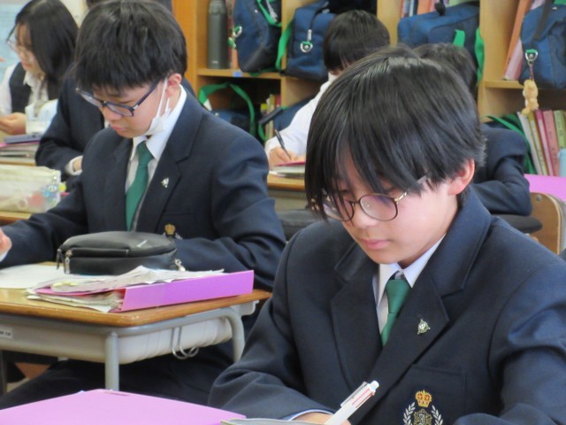 【写真・下】7年1・2組 英語(少人数)の授業の様子です。