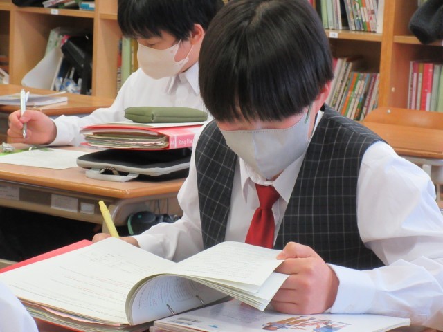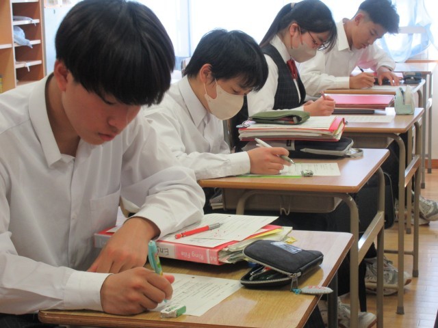 後半は「受け身」の復習に取り組みました。be動詞+過去分詞の形で「…される」という意味を表す受け身は、来週の学年末考査の試験範囲にも含まれています。例えば「世界遺産」のスピーチでも、Look at this picture. It was taken on Yakushima.(この写真を見てください。これは屋久島で撮られました)のような使い方で用いられていました。