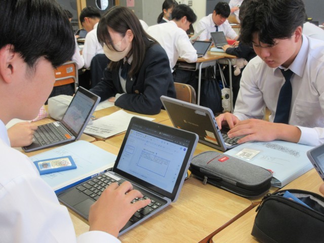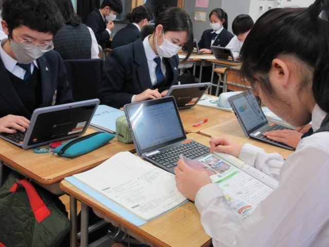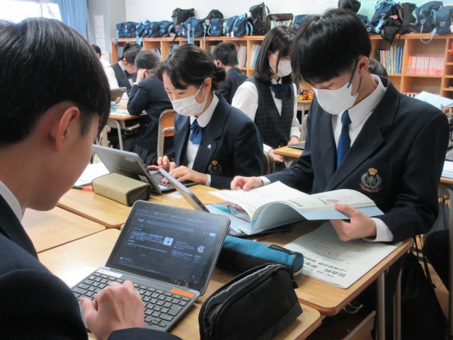 最後の単元『私たちと国際社会』の学習を終え、協働学習(調査活動)に取り組んでいます。授業でも取り上げた国際問題について班でテーマを決め、班内で分担して調べた結果を1つにまとめてプレゼンテーションします。