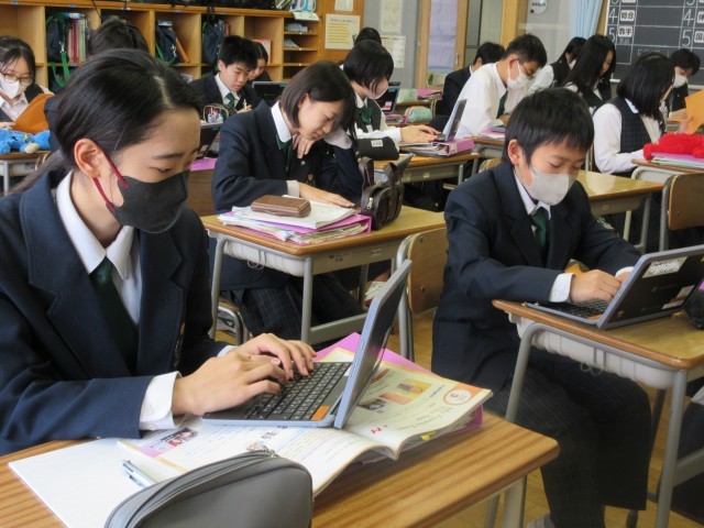【写真・中】8年5組「総合的な学習の時間」の様子です。