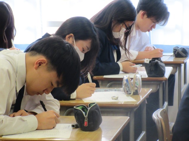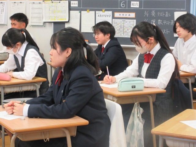 「9年生の進路講話を聞く会」を行っていました。別室で入試体験を語ってくれる9年生とオンラインでつながり、勉強の仕方や心構え、失敗談などを聞かせてもらいました。都立推薦・一般、私立推薦・一般と4人の先輩の体験談だったので、それぞれの入試の特徴や準備しておかなければならないことなどが具体的にわかりましたね。