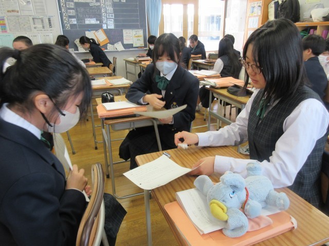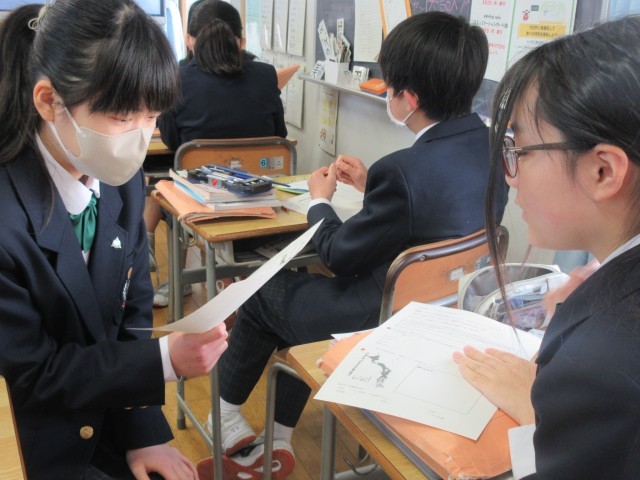 言葉の特徴や使い方・言語文化に特化した小単元『方言と共通語』に取り組んでいます。電子黒板には、ある共通のものを表す方言として「ボイボイ」「モンジャ」「ワン」等の分布図(日本地図)が映し出されていました。隠されていた東京や関東近県の共通語が種明かしされると、皆さん一様に驚いていました。