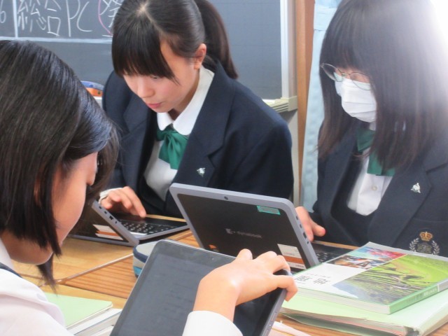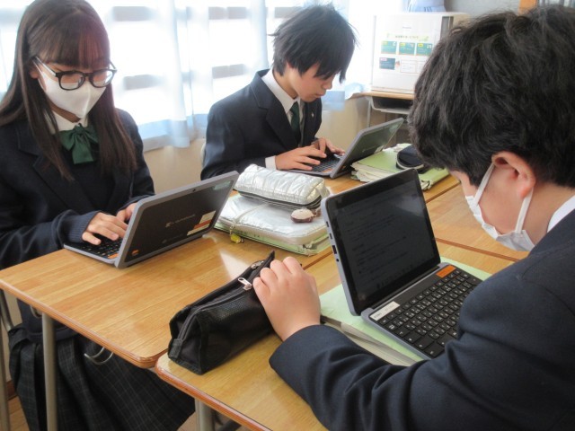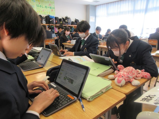 この時間は、各自で担当した分野のスライド作成に取り組んでいました。スライドは最低3枚作成し、1枚目は既習事項の説明、2枚目は図表やグラフ等の資料、3枚目は授業では取り上げなかった発展的内容という条件があります。今後は班員どうしでスライドの調整をして、クラス内の発表を行うそうです。