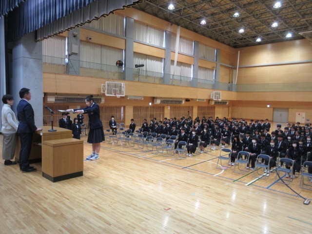 (写真・中・下)は、2年前から「答辞」に替えて導入した「立志の言葉」の練習風景です。「答辞」とは「告示・祝辞・式辞」等に答える言葉ですが、「立志の言葉」は未来に向け自分たちの志(思い)を述べる言葉です。そして「169名一人ひとりが主役」という視点から、学年全員で「盛り込みたい内容や言葉」を話し合いました。それらを紡いでまとめたものを、代表生徒5人が述べます。