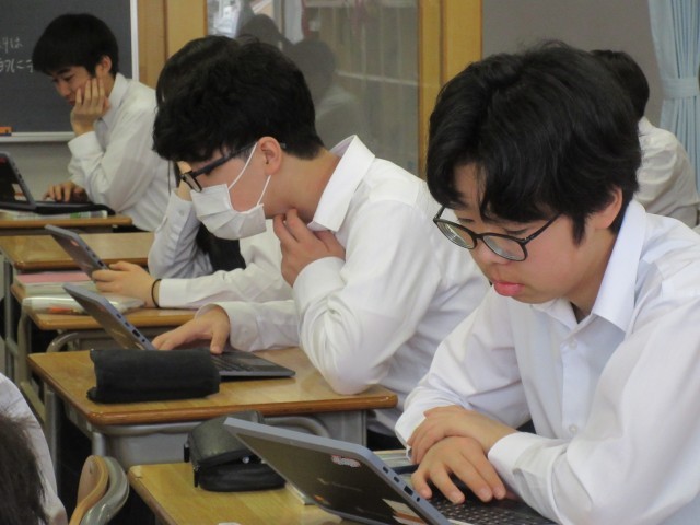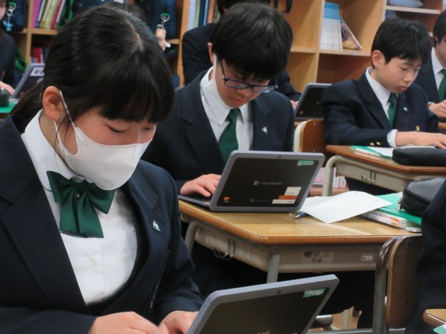【写真・下】7年2組「総合的な学習の時間」の様子です。