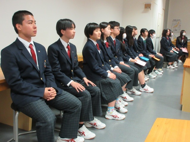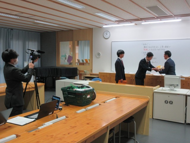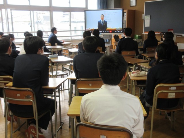 時間の関係で会場と教室とをつないだオンラインでの実施でしたが、各先生方に代表生徒からお礼の言葉と花束が贈られ、先生方からはお別れの言葉をいただき心温まる式となりました。なお、今年度末をもって転出(退職)される先生の詳細は、本日発行の校長通信をご覧ください。