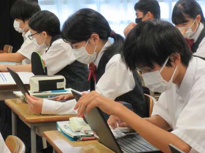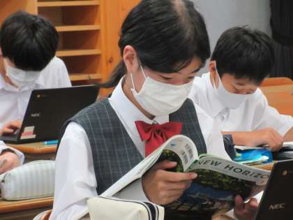 まず、それを各自のChromebookで読み取り、聞こえてくるネイティブスピーカーの範読を聞き直しながら音読の練習をしました(写真・上)。練習を終えると今度は自分で音読し、それをChromebookに録音します(同・下)。録音した音声は、このグループのClassroomに提出します。