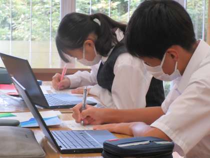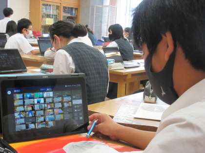 完成した作品『自画像』のクラス内鑑賞会を行っていました。友達の作品を鑑賞し、気づいた点や参考になった点などをシートにまとめます。1学期までこうした活動は、グループ内で作品を回し見しながら行っていました。