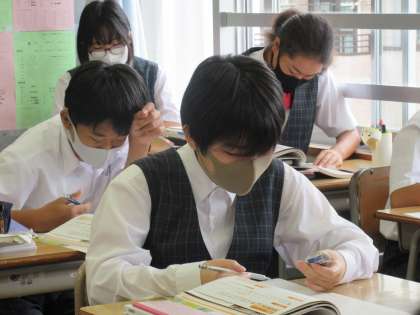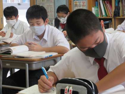 本日は偶然、3学年とも国語の授業を取材しました。そして、これも偶然ですが、7年生は8年生と同様に古文の学習でした。教材は「かぐや姫」の話として知られる『竹取物語』です。