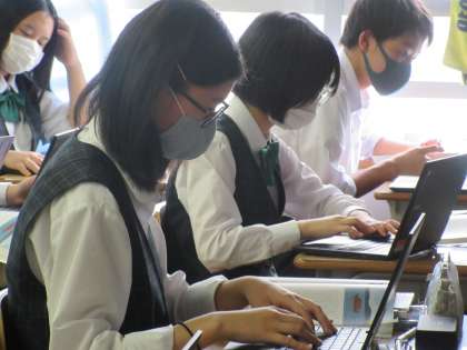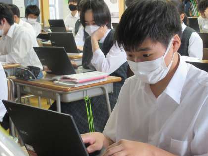 Chromebookを使用し【希望を抱くことが、偶像崇拝に過ぎないとしても…】に続ける形で自分の考えをまとめます。まとめたものはクラス全員で共有するので、友達の考えも参考にしながら再考している人もいました。