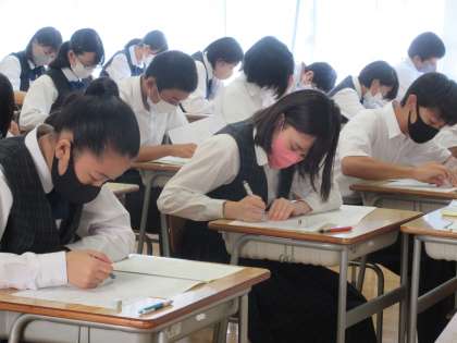授業を大切にする本校では、定期考査最終日のテスト終了後は通常授業としています。本日も学活等の授業の後、給食を挟んで午後からは生徒会立会演説会(リモート)も行われました。