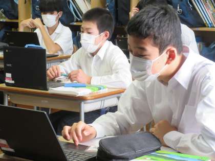 各自の考えは、キーボードで打ち込んだ人もいれば、タッチペンでイラストも交えた手書きの人もいます。ICTを頼るだけでなく、先生の目にとまった人の考えは改めて補足説明してもらっていました。