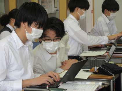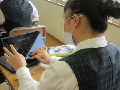 ところで、9年生の数学では、学習者(生徒)用のデジタル教科書も導入しています。慣れた手つき(親指と人差し指)で教科書の画面を拡大して見ている人もいます(写真・下)。それも、まさに「相似」ですね。