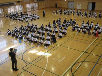 【写真・上】7年生・合同学活の様子です。上記でお伝えしたように、文化祭の合唱隊形の練習をしています。今年度初めて会場を文化会館に変更して実施するので、生徒だけでなく先生方も指示を出すのに苦労されています。