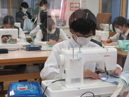 【写真・中】8年1組・技術家庭(家庭分野)の様子です。実習『トートバッグ製作』に取り組んでいます。感染症対策で、対面の作業では間にアクリル板を立てています。次回が最終授業なので、皆さん一生懸命でした。