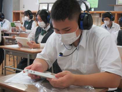 【写真・下】9年生「東京都スピーキングテスト」の様子です。その名のとおり、英語の技能のうち「話すこと」に特化したテストです。説明や監督は、外部スタッフの方が担当されています。