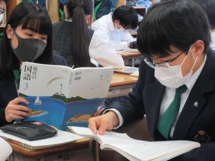 後半は、教科書本文の読みの練習をしたのですが、個人読み(写真・上)グループ読み(同・下)とも正しい姿勢で読んでいる点に感心しました。