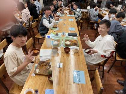 18時10分からの夕食の様子です。メニューは、ハンバーグや海老フライ、海鮮シュウマイなどです。皆さん、モリモリ食べています。