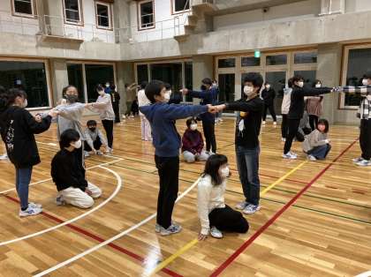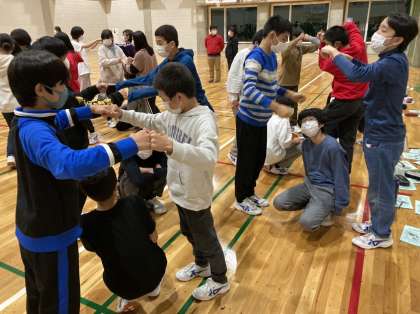 レクリエーション大会後半は、皆に体を動かしてもらいながら、男女関係なく仲良くなってもらうアクティビティでした。生徒に混ざって参加されている先生もいて、こちらも大いに盛り上がりました。