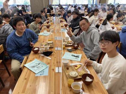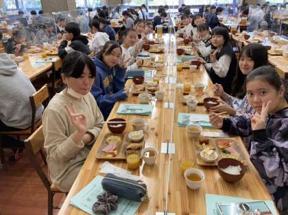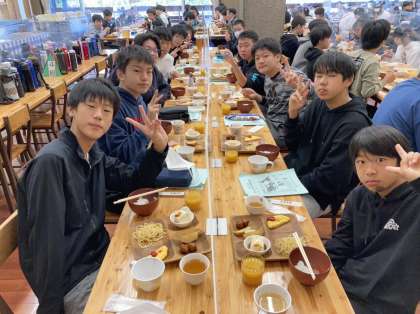 今朝のメニューは、オムレツやスパゲティ、ハム、野菜などです。宿泊行事での食事時間は、友達との楽しい語らいの時でもありますが、感染症対策のために黙食で通した生徒の皆さんは、立派です。