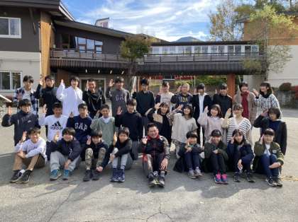 閉園式後、バスに乗り込む前に、宿泊前でクラス写真を撮りました(上=1組・下=2組)。