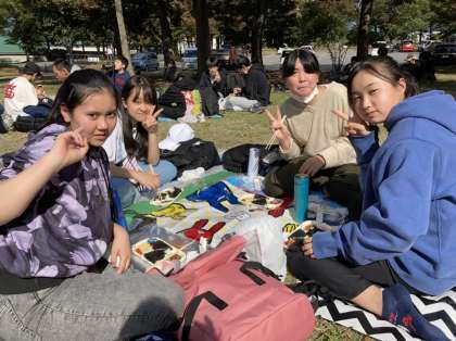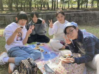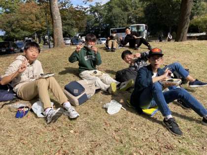 好天に恵まれ日差しも暖かいので、屋外で食べるお弁当も一段と美味しく感じられます。ただし、最後まで感染症対策のため黙食は徹底しています。