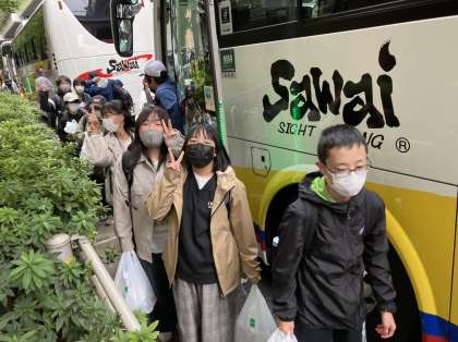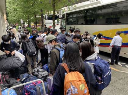 14時45分 学校(氷川神社脇の17号線)に到着しました。生徒たちはバスから荷物を受け取り次第、流れ解散です。