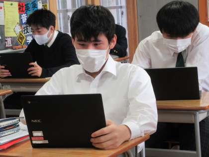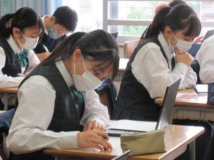 この時間は、都立高入試用の自己PRカードを作成していました。自己PRカードは点数化されませんが、面接資料や意欲等の確認、合否判定の補助資料として用いられます。Chromebookで書き方のポイントを調べるなど、行事モードから入試モードにしっかり気持ちを切り替えていました。