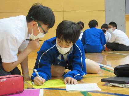 7年生は、総合の時間を活用して「減災学習」に取り組んでいます。この学習は、減災について「自分の興味・関心のあることを探求する」と「探求したことを誰かに伝える」という2つの側面から進めます。