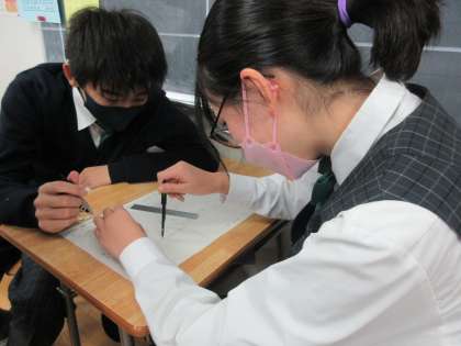 3つのグループ全てで『作図スペシャル16問』というプリントに取り組んでいました。都立高入試問題(共通問題)には、例年作図問題も出題されます。先生がその傾向を分析してまとめられた問題が、16問出ています。