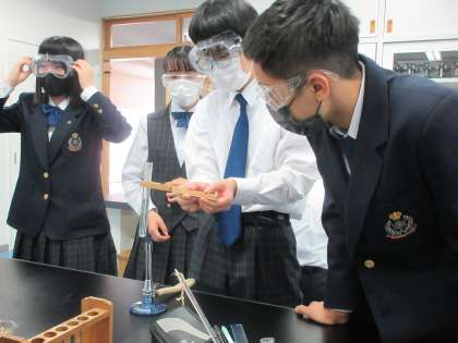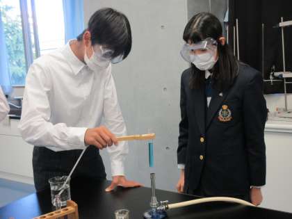 唾液を入れた試験管と水を入れた試験管を体温程度に温めた後、それぞれにベネジクト液を入れて煮沸させ、変化を調べます。手順は簡単ですが、試薬を使い突沸の危険もあるので、真剣に安全最優先で取り組んでいました。