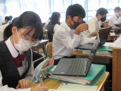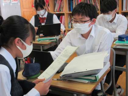 『身近な地域の調査』に取り組んでいます。地理分野の学習では必修の内容で、観察や調査方法の基礎知識や、地形図等の見方や用途に応じた地図の作成方法といった基礎技能の習得を目指します。また、調査方法や結果を多面的・多角的に考察し表現する思考・判断・表現力も身につけます。