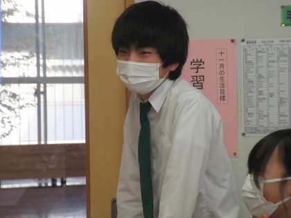 【思いやり・感謝】をテーマに、教科書から『塩むすび』という読み物を使用しています。10年前の東日本大震災で被害を受け福島県で避難所生活を送る中学生が、食事係のボランティアに従事した体験を綴った実話です。