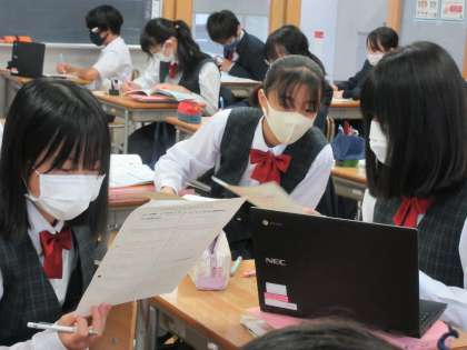 『比例と反比例』の学習です。少人数編成なので、2クラスを3グループに分けて授業を行っています。そのうち2グループにお邪魔しましたが、期末考査前ということもあり、どちらも演習に取り組んでいました。