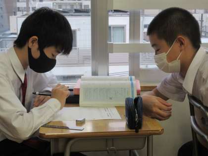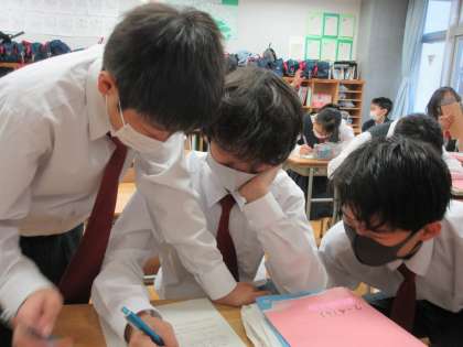 緊急事態宣言が解除され、新型コロナの新規感染者数も減少傾向にあります。そんなことから、授業中の教え合いも再開されてきました。もちろん油断はしていませんが、2グループとも写真のような光景が見られています。