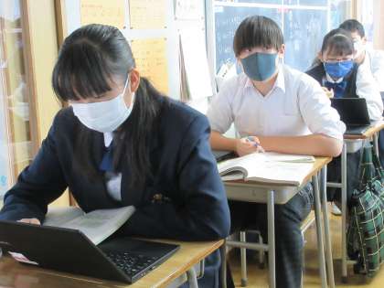 【写真・下】9年3・4組 数学(少人数)の授業の様子です。