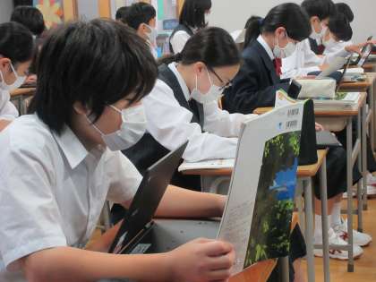 Unit-7『 Foreign Artists in Japan(日本の外国人芸術家)』の学習です。先生がChromebookに貼り付けてくださったURLから本文の範読を聴き、リーディング(読み)の練習を行っているところです。