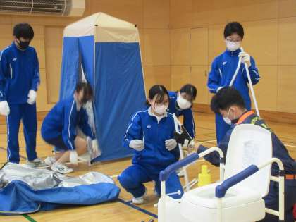 【写真・上】避難所を設置した際に必要となるマンホールトイレの組み立て訓練です。同時並行で、間仕切りの組み立て訓練も行いました。実際に組み立てた間仕切りの中に入り、その広さも体験しました。