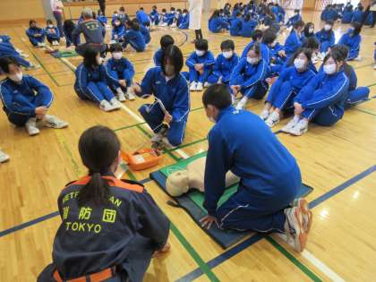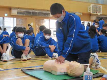 胸骨圧迫の心肺蘇生法や、電気ショックを施すためのAED(自動体外式除細動器)の使用法などを教えていただきました。ちなみに本校のAEDは、保健室前の下駄箱の上に設置してあるので覚えておきましょう。