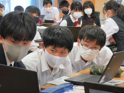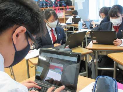 授業では、新津さんの体験談や仕事に対する考え方を読み、「自分が家族やクラスに貢献していること(働き)」や「それをプロのレベルまで引き上げるために必要なこと」等について考え、ウェブ版ホワイトボードともいえるJamboard(ジャムボード)上に付箋を貼り付け、意見共有しました。