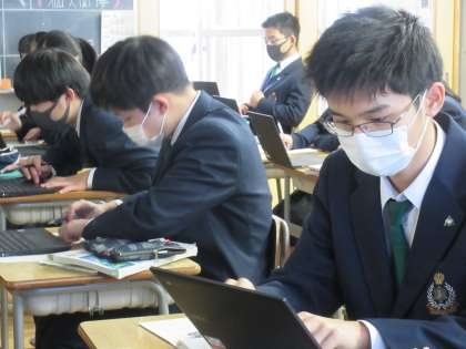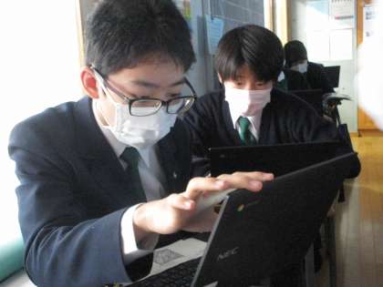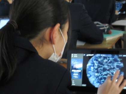 照明を消した教室で、皆さん熱心にChromebookを操作しています。黒板には授業のめあてが【ステラリウムで確認した天球上の星の動きを記入できる】とあります。「ステラリウム」に興味をもったのでお邪魔しました。