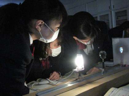 焦点の位置や、焦点より遠い(近い)位置について、班員で協力しながら像のでき方を確認し記録しました。暗くなった理科室では見えづらかったのですが、皆の表情が集中していることは十分にわかりました。
