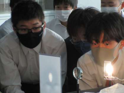本日は、3学年とも理科の授業を取材させていただきました。7年生は、身の周りの現象のうち『光の世界』を学習しています。教室を暗くして実験することの多いこの単元は、カメラのピントが合わず取材者泣かせです。
