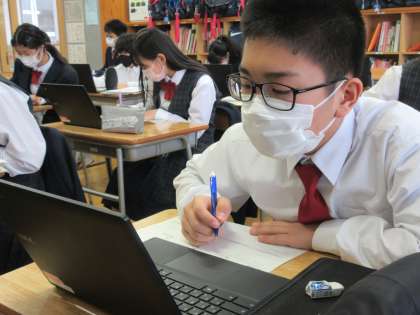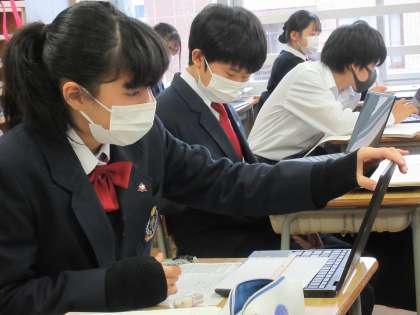 その際には(制作した上で)頑張ったこと・工夫したことを2文以上で書き、コメントとして添えています。本日は、そのデータを共有して鑑賞会を行っていました。全員の作品とコメントが貼り付けられているので、各作品をピンチアウト(指で拡大)したりしながら鑑賞します。