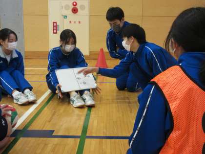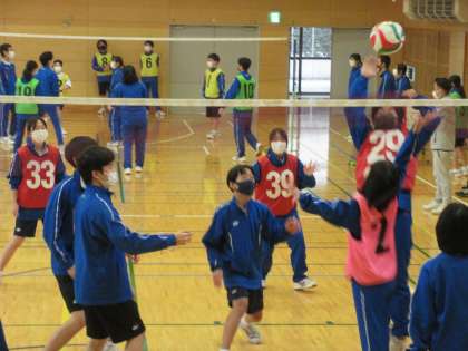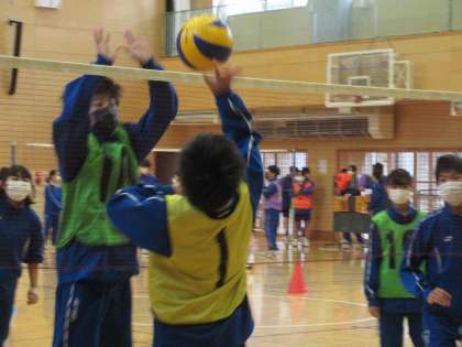 この授業も、7・9年生が共習で『バレーボール』に取り組んでいました。異学年合同チームでのゲーム練習では、9年生が7年生の手助けをしたり、7年生は9年生の技能に学んだりと、双方にメリットがあります。