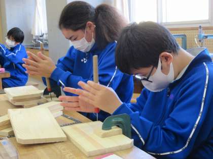 『木材加工』の実習です。パイン材の教材キットを使用して、CDラックやブックスタンドなど15種の作品タイプの中から選んだものを製作しています。多くの人が、最終段階の釘打ち作業に入っていました。