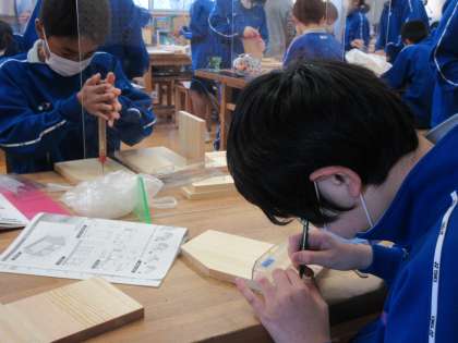 本日は、時間割を入れ替えて2時間続きの実習です。1時間目にお邪魔した際、ジグやキリを使って下穴を開ける作業をしていた人たちが、2時間目には満を持して釘打ちに入っていました(写真・下)。