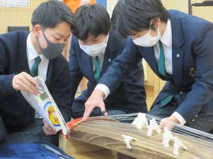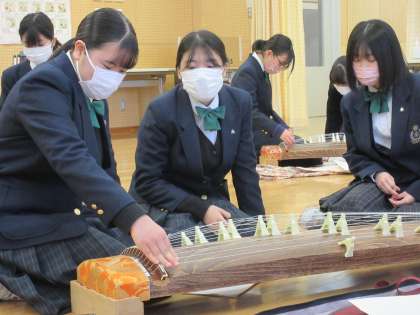 廊下に箏(箏)の音色で、♪ さくら、さくら… が聞こえてきました。以前もお伝えしましたが、音楽の授業では和楽器も取り扱うことになっています。そのため、箏の実技に取り組んでいるところでした。