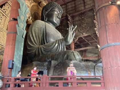 高さ約18メートル。手のひらは約2・3メートル、眉毛の長さは私とほぼ同じ1・7メートル。さすがに見た瞬間、何人か人がおーっと声を上げます。「1000年に一度、立ち上がるのですよ」という私の冗談を、純粋な○○さんは「本当ですか!」と信じてしまいました。